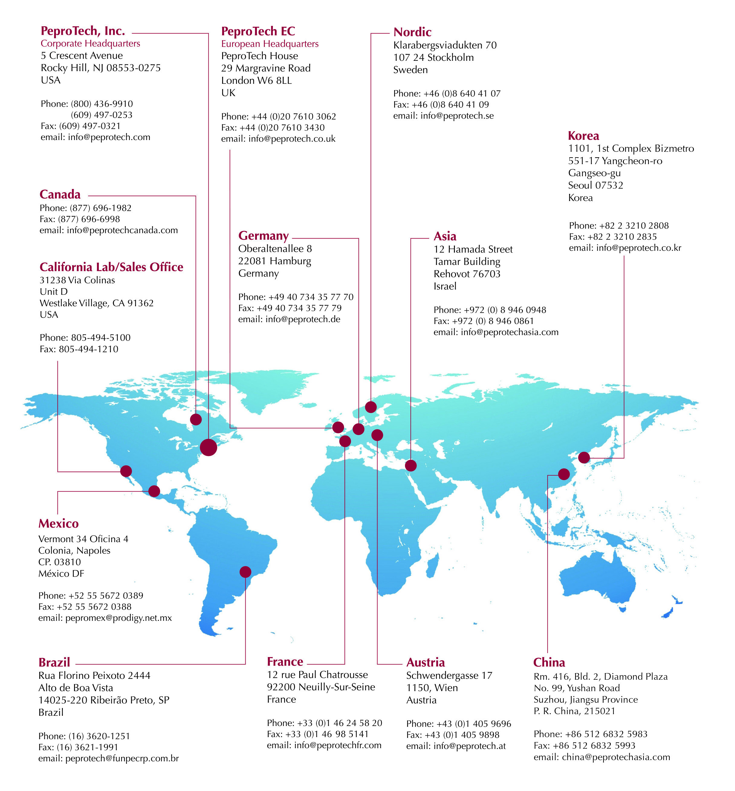 PeproTech 公司創(chuàng)立于1988年,總部位于美國新澤西州。 PeproTech 公司始 終致力于為生命科學(xué)研究和細(xì)胞治療市場提供高品質(zhì)的細(xì)胞因子產(chǎn)品。在過 去的27年 里,PeproTech在推動這些領(lǐng)域的發(fā)展中一直扮演著重要角色。美 國總部的先進(jìn)生產(chǎn)設(shè)施和遍布十余個國家的客戶服務(wù)網(wǎng)絡(luò),使得PeproTech 公司成為科研工作者可以信賴的合作伙伴。同時,來自科研院所和工業(yè)界的 研究人員為我們產(chǎn)品線的不斷擴(kuò)充提供了寶貴的意見和創(chuàng)意源泉。PeproTech 公司運(yùn)用創(chuàng)新方法開發(fā)出 2000 余種高品質(zhì)、高穩(wěn)定性和重復(fù)性的 產(chǎn)品,包括大腸桿菌、昆蟲細(xì)胞和哺乳動物細(xì)胞來源的重組細(xì)胞因子/蛋白 、相關(guān)單克隆/多克隆抗體、ELISA試劑盒、無血清細(xì)胞培養(yǎng)基以及其他細(xì)胞 因子相關(guān)試劑。欲了解 PeproTech 全套產(chǎn)品線、獲取產(chǎn)品詳情和參考文獻(xiàn)等,請?jiān)L問其官網(wǎng):www.peprotech.com。