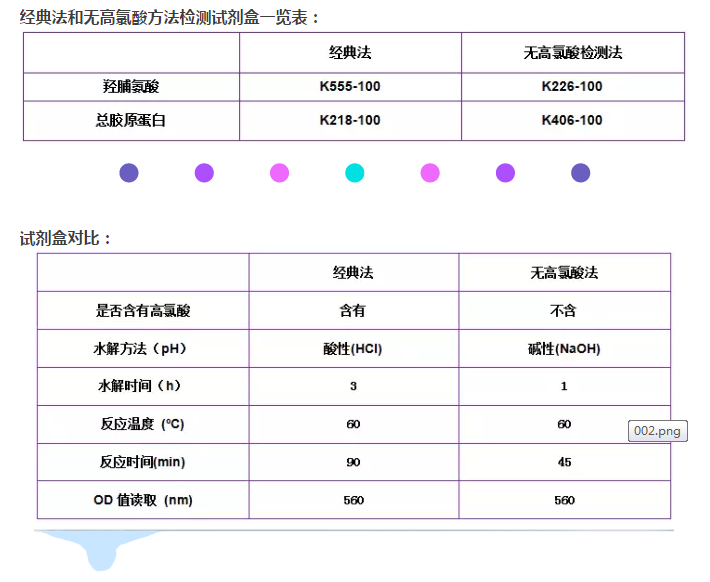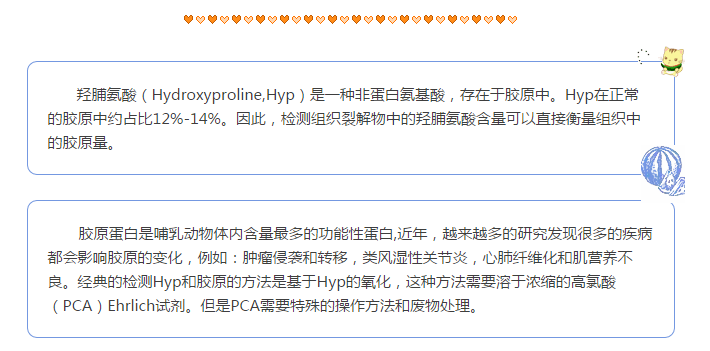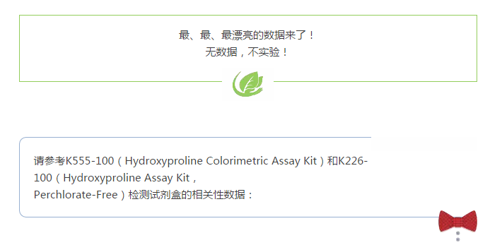Figure (A). 經(jīng)典高氯酸法檢測(cè)的試劑盒(k555-100)和無(wú)高氯酸法檢測(cè)試劑盒(k266-100)的標(biāo)準(zhǔn)曲線(xiàn)之間的相關(guān)性比較。數(shù)據(jù)顯示此兩種檢測(cè)方法具有非常好的相關(guān)性(R2 > 0.999)。 (B). K266-100試劑盒檢測(cè)大鼠樣本中的總羥脯氨酸的含量。