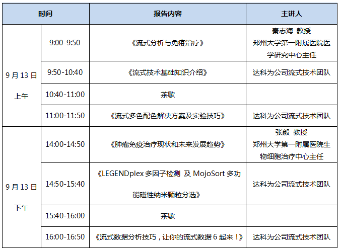 金秋九月,達(dá)科為流式培訓(xùn)班要來鄭州啦,名師講解,理論與實驗雙管齊下,輕松完成流式八色檢測分析,更有LEGENDplexTM多因子Demo演示,磁珠分選Demo以及De Novo 流式軟件數(shù)據(jù)分析演示。流式上機(jī)名額有限,歡迎踴躍報名!理論培訓(xùn)和實驗操作均免費(fèi)喲!