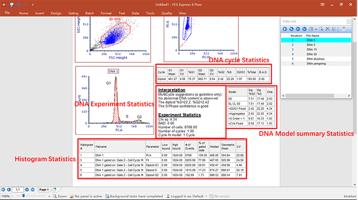 c.當(dāng)完成細(xì)胞周期數(shù)據(jù)分析后,接上面一步,可以通過(guò)Statistics按鈕,將相關(guān)的參數(shù)調(diào)出來(lái),具體展示如下: