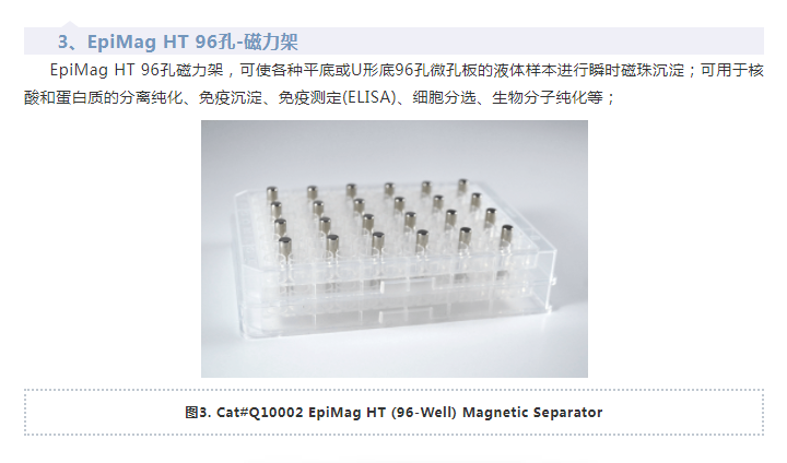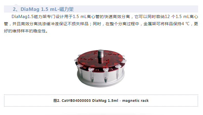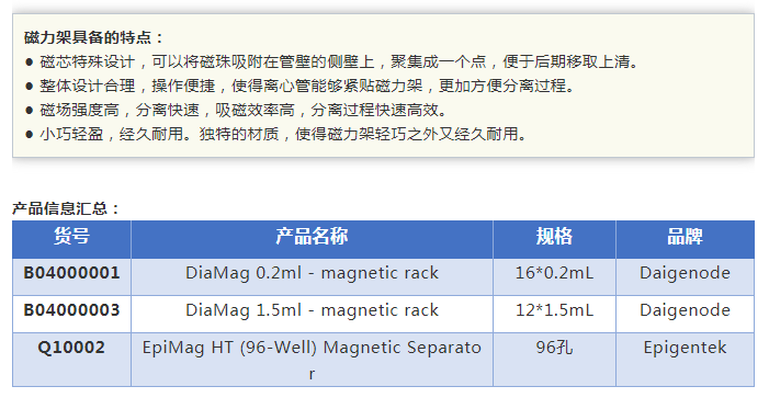 在分子實(shí)驗(yàn)過(guò)程中,磁珠法核酸純化、磁珠法免疫沉淀實(shí)驗(yàn)如:IP,Co-IP,ChIP等,都需要一個(gè)高效金屬磁力架,它不僅可以實(shí)現(xiàn)核酸和蛋白質(zhì)的高效磁珠分離,還可以簡(jiǎn)化實(shí)驗(yàn)操作提高實(shí)驗(yàn)效率。隨著磁珠在核酸或蛋白分離方面的應(yīng)用普及,磁力架成為了實(shí)驗(yàn)室的必備小工具。