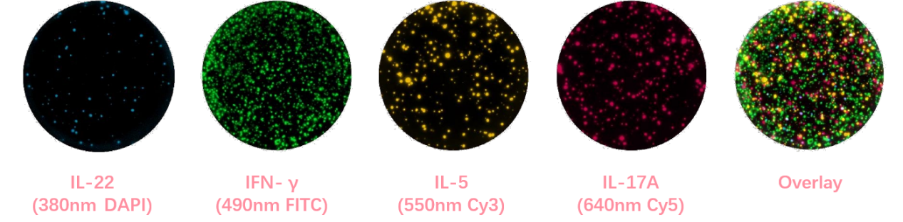 該圖為Mabtech FluoroSpot Plus: Human IL-22/IFN-γ/IL-5/IL-17A(Cat#FSP-18010803-2)的實(shí)驗(yàn)結(jié)果,四個檢測通道對應(yīng)的DAPI,F(xiàn)ITC,Cy3,Cy5。