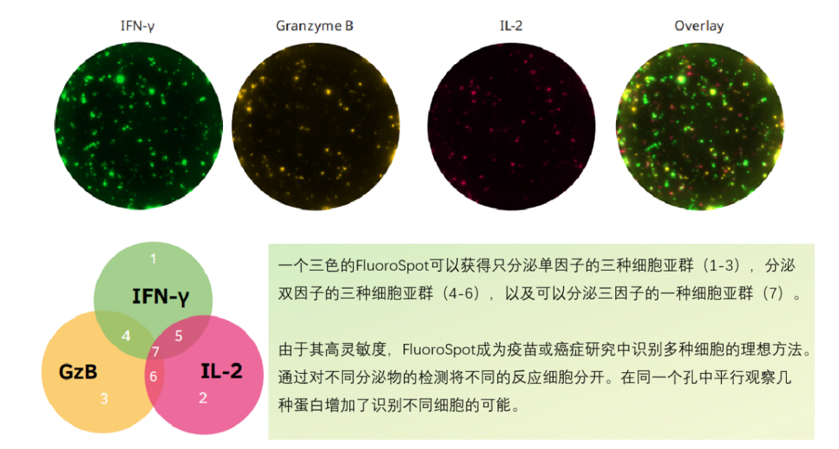 相比于ELISpot,F(xiàn)luoroSpot依舊維持了ELISpot的高靈敏度,還能對單細(xì)胞分泌的多種細(xì)胞因子同時進(jìn)行檢測,從而實(shí)現(xiàn)細(xì)胞亞群的鑒定和細(xì)胞多功能性分析。