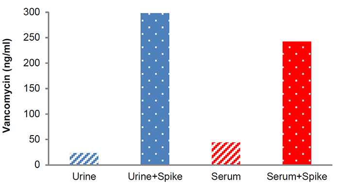 加標(biāo)回收實(shí)驗(yàn): 人血清和尿液樣本加300ng/ml的萬(wàn)古霉素,回收率為80-100%。