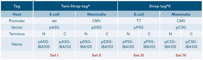 SetⅠ與SetⅡ為Twin-Strep-tag?(三代純化標簽),SetⅢ與SetⅣ為Strep-tag?II(二代純化系統(tǒng))標簽。每組載體包含兩個1μg帶Amp抗性的載體,分別為Tag在N-Term或C-Term的載體