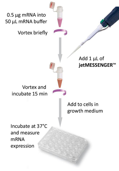 mRNA轉(zhuǎn)染是針對難轉(zhuǎn)染細(xì)胞如神經(jīng)元、原代細(xì)胞和懸浮細(xì)胞(淋巴細(xì)胞)的一種新的解決方法。這種轉(zhuǎn)染方法相較于DNA轉(zhuǎn)染有很多優(yōu)點:更高的轉(zhuǎn)染效率、轉(zhuǎn)染后更快速的蛋白表達(dá)以及較低的基因插入突變風(fēng)險。mRNA瞬時轉(zhuǎn)染可用于很多用途,包括細(xì)胞重編輯,基因編輯(CRISPR/Cas9)及疫苗研發(fā)。Polyplus-transfection?公司研發(fā)了一款新型的mRNA轉(zhuǎn)染試劑jetMESSENGERTM,難轉(zhuǎn)染細(xì)胞現(xiàn)在很容易轉(zhuǎn)染!