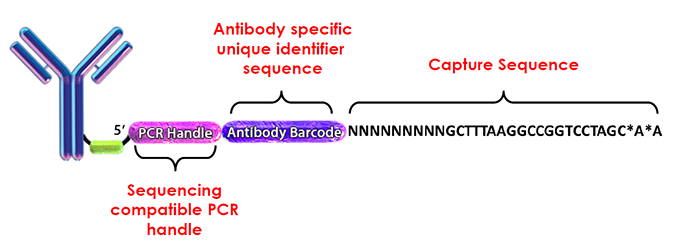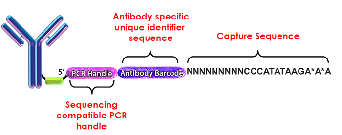 寡核苷酸序列由以下幾部分組成,PCR引物,特異性標(biāo)簽序列(即特異性Barcode)以及Capture序列。Totalseq?-A、B、C如下:
