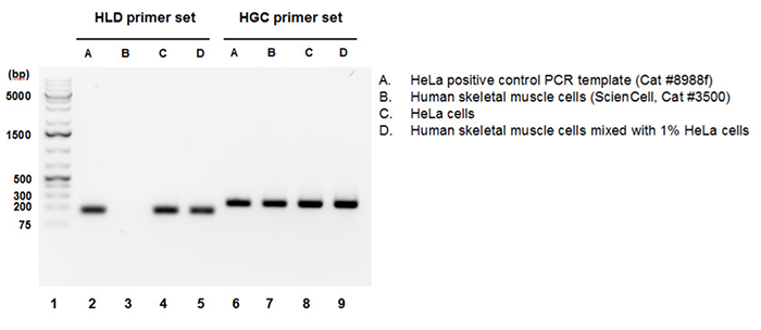 HeLa基因組DNA(gDNA)檢測(cè)引物組分(HLD)識(shí)別并擴(kuò)增基因組中不存在于其他人類細(xì)胞的HeLa細(xì)胞特異性序列。