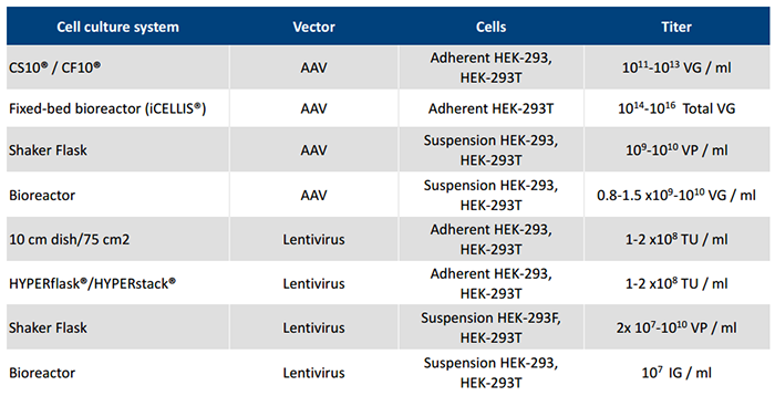 不管細胞培養(yǎng)體系和生產(chǎn)規(guī)模如何, PEIpro?和PEIpro?-HQ 均可獲得較高的病毒產(chǎn)量,慢病毒的病毒滴度超過107IG/mL,而AAV的病毒滴度超過109 VG/mL。