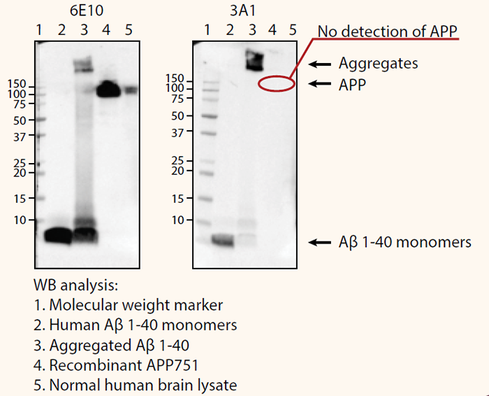 在WB實驗中檢測克隆號3A1抗體針對人Aβ1-40單體、Aβ1-40聚集體、重組人APP751蛋白和正常人腦裂解物的特異性。與克隆號6E10抗體相反的是,3A1與APP無交叉反應(泳道4、5)但是與Aβ1-40聚集體顯著反應(泳道3)。與6E10相比,3A1表現(xiàn)出對Aβ1-40單體的較弱反應性(泳道2、3)。