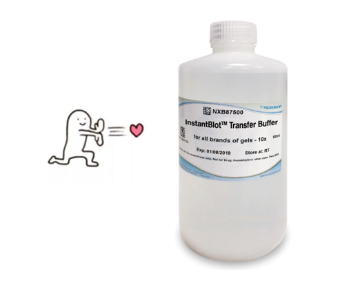 當(dāng)然蛋白電泳只是WB實(shí)驗(yàn)的第一步,那還有什么方法能加快后續(xù)實(shí)驗(yàn)(如轉(zhuǎn)膜)進(jìn)程呢?別急,今天就給大家介紹一款來(lái)自分子產(chǎn)品專家Expedeon公司的快速轉(zhuǎn)膜液——InstantBlot?Transfer Buffer(貨號(hào):NXB87500),作為Expedeon的一款專利產(chǎn)品,該轉(zhuǎn)膜液能夠大幅提升蛋白從“膠”至“膜”的轉(zhuǎn)移速度,最快只需10 min即可完成轉(zhuǎn)膜,并且不會(huì)產(chǎn)生過(guò)多的熱量,避免影響蛋白的后續(xù)檢測(cè)。
