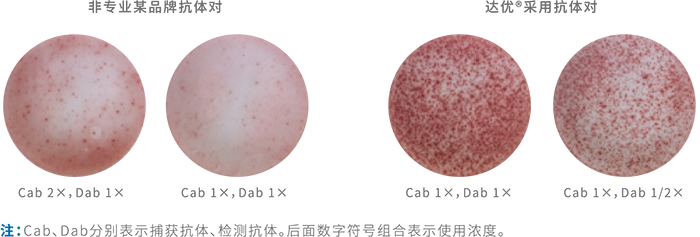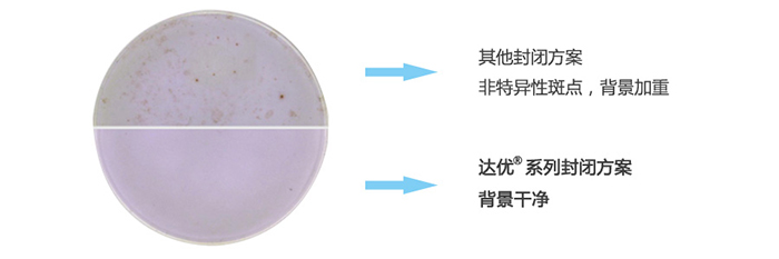 不同的檢測樣本在板孔培養(yǎng)過程中,受各種實驗條件影響,如果封閉不當都可能產(chǎn)生非特異性顯色,導(dǎo)致非特異性斑點的產(chǎn)生或者背景顏色的加重。這將直接影響到最后結(jié)果的判斷分析。達優(yōu)?系列產(chǎn)品通過大量實驗,對不同來源、不同配方封閉方法進行封閉效果的對比試驗,篩選出更高效的封閉系統(tǒng),并將之運用到系列試劑盒產(chǎn)品中。