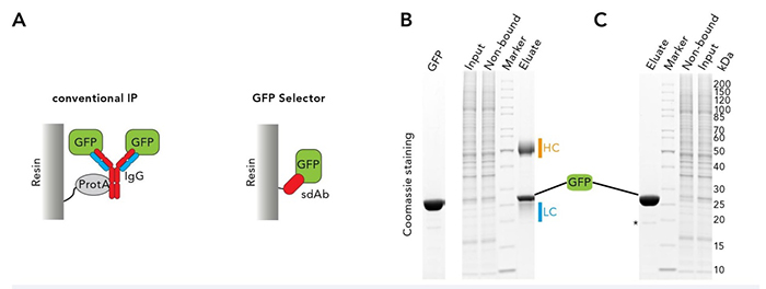 傳統(tǒng)的GFP融合蛋白免疫沉淀是基于與GFP特異性抗體非共價(jià)鏈接的protein A或protein G結(jié)合在固相,從而拉下蛋白的原理(見(jiàn)圖1 A),其產(chǎn)率和效率通常受限于一抗的特異性和固相上protein A/G的結(jié)合能力。通常,在用SDS緩沖液洗脫時(shí),抗體發(fā)生變性并與GFP融合蛋白及相互作用的配體一起從樹(shù)脂上分離下來(lái)。因此,洗脫液中通常含大量一抗重鏈和輕鏈(見(jiàn)圖1 B),妨礙鑒定蛋白的相互作用,還有可能影響下游實(shí)驗(yàn),比如蛋白質(zhì)印跡或質(zhì)譜分析。