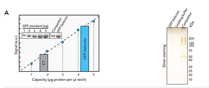 將GFP Selector和競(jìng)爭(zhēng)產(chǎn)品與飽和的重組GFP蛋白孵育,通過(guò)SDS-PAGE和考馬斯染色分析1μl樹(shù)脂的容量;
