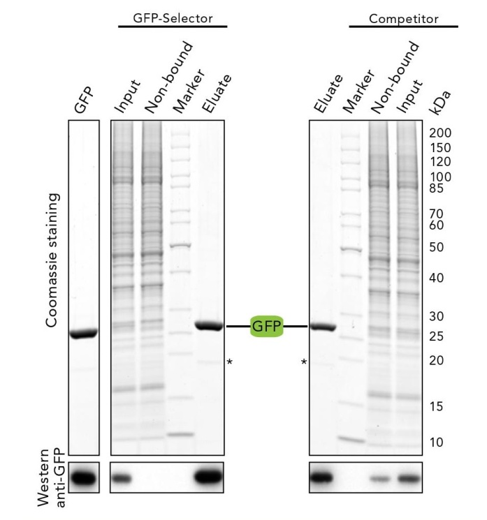 將等量GFP Selector和競(jìng)爭(zhēng)產(chǎn)品與1ml含GFP標(biāo)記蛋白的HeLa裂解物一起孵育,通過(guò)考馬斯染色和蛋白印跡分析上樣、洗滌產(chǎn)物、洗脫產(chǎn)物。