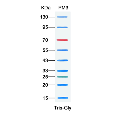 預染蛋白Marker是將幾種純化好的蛋白,與染料共價偶聯(lián)后混合而成。預染蛋白Marker的出現(xiàn)方便我們在電泳時、電泳后以及轉(zhuǎn)膜后檢測電泳情況和估計遷移率,是做WesternBlot最常用到的蛋白Marker。
