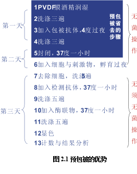 如圖2.1所示,預(yù)包被有著明顯的技術(shù)優(yōu)勢。PVDF板的ELISPOT試驗一共需要3天時間,采用預(yù)包被板可以節(jié)省一天的時間,當(dāng)天處理細(xì)胞,當(dāng)天上板檢測;未包被的檢測共有13步,預(yù)包被可以省掉其中的5步,并且這5部都是需要無菌操作的步驟,占整個無菌操作步驟的5/6。節(jié)省時間只是其一,由于減少了無菌操作的步驟,使得整個實驗污染與出錯的概率大大降低,提高了整體試驗的成功率。
