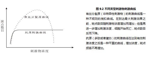 其一、非特異性的刺激物刺激效果不穩(wěn)定。如圖9.2所示,非特異性的刺激物(有絲分裂原Mitogen)的刺激曲線(xiàn)幾乎沒(méi)有平坦的部分。也就是說(shuō),刺激物的濃度有細(xì)微變化,馬上就會(huì)體現(xiàn)在刺激斑點(diǎn)數(shù)目的變化上了,這樣實(shí)驗(yàn)結(jié)果很難完全重現(xiàn)。相反,抗原的刺激曲線(xiàn)非常平坦,只要達(dá)到有效刺激濃度,斑點(diǎn)頻率就不再變化。