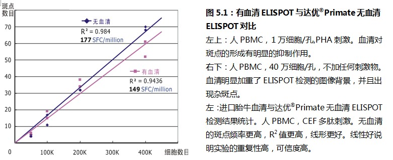 達(dá)科為公司做了一系列的有、無血清ELISPOT檢測對(duì)比試驗(yàn),并且在推廣ELISPOT技術(shù)的標(biāo)準(zhǔn)化以及建立ELISPOT檢測的質(zhì)控系統(tǒng)時(shí),都采用了無血清ELISPOT檢測技術(shù)。在所有的實(shí)驗(yàn)中達(dá)優(yōu)?都取得了優(yōu)于血清的結(jié)果??偨Y(jié)起來就是:背景更干凈,信噪比更高,頻率更穩(wěn)定,結(jié)果更真實(shí)。下圖5.1是一些實(shí)際案例。