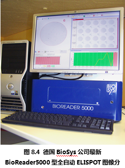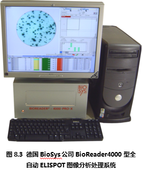 德國(guó)Bio-Sys公司從上世紀(jì)80年代開始就致力于生物圖像識(shí)別領(lǐng)域,在進(jìn)入ELISPOT圖像分析儀市場(chǎng)后一直以其先進(jìn)的ELISPOT斑點(diǎn)識(shí)別技術(shù)聞名。德國(guó)Bio-Sys公司首先解決了顯微攝像系統(tǒng)難以定位96孔板上的每一個(gè)孔的問題。其解決方法基于圖像識(shí)別技術(shù),利用板孔邊壁和真正的孔底的細(xì)微差別,在機(jī)械定位的基礎(chǔ)上,通過(guò)軟件識(shí)別來(lái)進(jìn)一步提高每孔的定位精度。是目前市場(chǎng)上所有ELISPOT圖像分析儀中唯一能夠完整識(shí)別整個(gè)孔底ELISPOT斑點(diǎn)圖像的設(shè)備。在對(duì)真假斑點(diǎn)的分辨中,德國(guó)Bio-Sys公司除了具備完善的物理學(xué)多參數(shù)識(shí)別技術(shù),還特別針對(duì)ELISPOT斑點(diǎn)形成的生物學(xué)過(guò)程,通過(guò)細(xì)胞因子顯色后的“光密度”峰值積分分析方法,精確分辨真假斑點(diǎn)、融合斑點(diǎn)等復(fù)雜情況。Bioreader系列ELISPOT圖像分析儀國(guó)外大多數(shù)較有經(jīng)驗(yàn)的ELISPOT實(shí)驗(yàn)室推崇的特點(diǎn)為:專業(yè)性和參數(shù)全開放性。因?yàn)镋LISPOT實(shí)驗(yàn)的復(fù)雜性,ELISPOT斑點(diǎn)形成在不同的實(shí)驗(yàn)條件下有非常大的差異。這就對(duì)ELISPOT圖像分析儀提出了較高的要求:既要能夠保證斑點(diǎn)計(jì)數(shù)的真實(shí)性和一致性,又要能夠根據(jù)不同情況,通過(guò)實(shí)驗(yàn)者的判斷來(lái)校正儀器對(duì)ELISPOT斑點(diǎn)識(shí)別的標(biāo)準(zhǔn)。要同時(shí)實(shí)現(xiàn)以上兩個(gè)要求,唯一的辦法是將儀器的所有判斷標(biāo)準(zhǔn)向ELISPOT實(shí)驗(yàn)者開放,實(shí)現(xiàn)實(shí)驗(yàn)者和儀器的互動(dòng)。在這一方面,德國(guó)Bio-Sys公司始終走在ELISPOT斑點(diǎn)識(shí)別領(lǐng)域的前列,新的Bioreader-4000型(圖8.3)和Bioreader -5000(圖8.4) 型在專業(yè)性和適用性方面都領(lǐng)先于其他廠家的設(shè)備。
