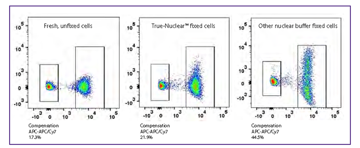 如果需要長(zhǎng)時(shí)間保存樣本,建議在樣本做完表面染色和固定后,保存在專門的保存緩沖液中。但即便是有專門的保存buffer,對(duì)于用了串聯(lián)染料(如APC/Cy7、PE/Cy7等)染色的樣本,我們還是建議不要長(zhǎng)時(shí)間保存,很難避免補(bǔ)償?shù)摹捌疲?/span>shift)”。