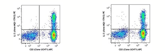 左圖:human PBMC刺激完當(dāng)天染色后上機(jī)檢測(cè);右圖:同一樣本,表染和固定后,保存在Cyto-Last? buffer里面,14天后做胞內(nèi)染色并上機(jī)。