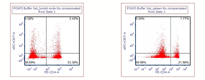 用BioLegend FOXP3 Buffer set對(duì)細(xì)胞進(jìn)行固定破膜處理后,染Ki-67抗體,左圖:小鼠淋巴結(jié)樣本;右圖:小鼠脾臟樣本。