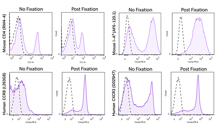 流式實(shí)驗(yàn)中,有一些情況我們希望或需要對(duì)樣本進(jìn)行預(yù)先固定處理,比如前文說(shuō)過(guò)的傳染病人的樣本或者是需要檢測(cè)蛋白翻譯后修飾的樣本。對(duì)于需要預(yù)固定的樣本,首先需要考慮預(yù)先固定處理對(duì)檢測(cè)指標(biāo)的影響,有很多指標(biāo)先染色再固定和先固定再染色出來(lái)結(jié)果差異非常大,導(dǎo)致這些差異原因和指標(biāo)的類型、抗體的克隆號(hào)等因素都有關(guān)系。
