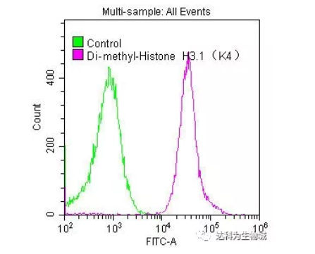 圖4. 使用1:50 稀釋的Histone H3.1K4me2單克隆抗體(貨號:A68400)對HeLa細(xì)胞進(jìn)行染色的覆蓋直方圖。