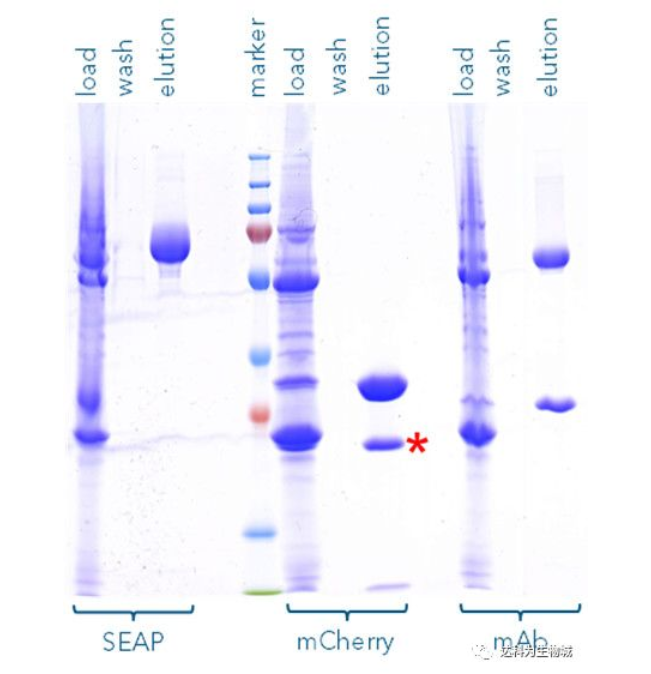 此外,我們也測(cè)試了其他的蛋白,例如SEAP(72 kDa)或抗體(mAb,其重鏈為55kDa)。圖B為以Strep-Tactin?XT純化SEAP-TST、mCherry-TST與mAb-TST的SDS-PAGE分析結(jié)果,可見(jiàn)對(duì)于不同蛋白,Strep-tag?系統(tǒng)都能純化出高純度的目標(biāo)蛋白。(注:紅色標(biāo)記處為 mCherry的降解產(chǎn)物,非雜帶)