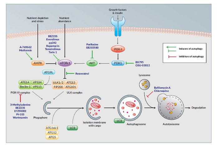 自噬是原生分解程序,由細(xì)胞內(nèi)應(yīng)激物(營養(yǎng)物和能量貧乏)引起。自噬由生成自噬體開始,這一步驟由一系列蛋白調(diào)控,包括VPS34的Ⅲ型磷脂?;迹?/span>PI)3激酶復(fù)合體,隨后與溶酶體的融合將自噬體酸化。自噬的阻斷有多種形式,例如Ⅲ型PI3激酶抑制劑可通過抑制自噬捕獲動(dòng)作而阻斷自噬進(jìn)程,或者用抑制溶酶體酸化的抑制劑阻止自噬溶酶體的形成和自噬降解。自噬進(jìn)程是被縝密調(diào)控的。mTORC1,一種對(duì)營養(yǎng)物和生長因子敏感的激酶,是自噬的主要阻遏器。因此,mTORC1及其信號(hào)通路的抑制劑可誘導(dǎo)產(chǎn)生自噬。