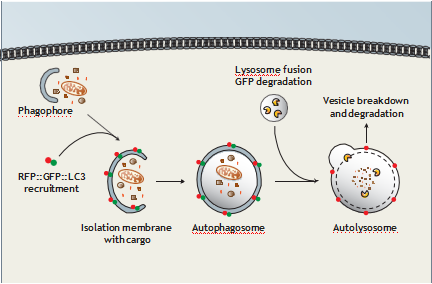 自噬通過溶酶體將胞漿物質(zhì)降解,是維持恒定程序的基本要素。研究自噬潮(autophagicflux)的關(guān)鍵蛋白是LC3(微管相關(guān)蛋白1輕鏈3)。在分離膜形成時胞漿中的LC3被招募并進(jìn)入自噬程序,此定位動作被視為自噬膜的特征,用以檢測自噬的生成和發(fā)展。由LC3B融合一個綠色熒光蛋白(GFP)和一個紅色熒光蛋白(RFP)組成的嵌合蛋白 ,是檢測自噬過程的簡單方法。自噬體的形成可被RFP-GFP-LC3標(biāo)記,顯示RFP和GFP雙信號。與溶酶體融合后,酸性環(huán)境可顯著降低GFP信號,RFP信號卻保持穩(wěn)定。隨著自噬研究熱度的不斷提高,自噬報告基因細(xì)胞作為自噬過程研究的工具越來越多的受到廣大科研工作者的關(guān)注。