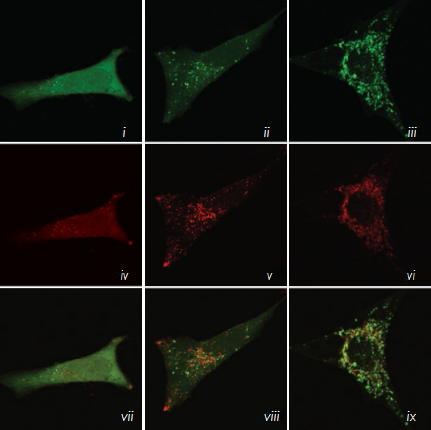 ☆HeLa-Difluo?hLC3細(xì)胞被25μM rapamycin 單獨(dú)處理或25μM rapamycin和 500nM bafilomycin A1(抑制自噬體和溶酶體融合)聯(lián)合處理。孵育24小時,用2% PFA固定細(xì)胞,并用共聚焦顯微鏡分析結(jié)果。請注意在圖片viii中,黃色(自噬體)和紅色(自噬溶酶體)斑點均顯著提升,而圖片ix中的斑點幾乎均為黃色(自噬體)。