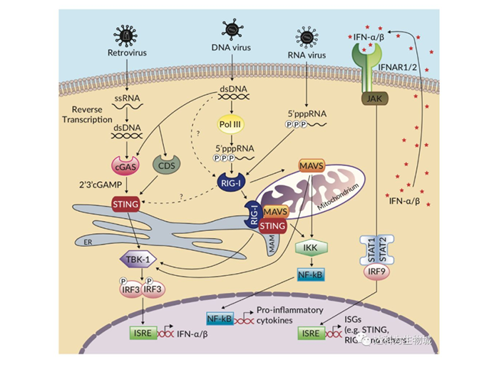 感受器cGAS和RIG-I通過單獨的接頭蛋白來識別不同的核酸和信號。cGAS感受細胞質(zhì)中異常DNA的存在和濃度,而后通過環(huán)二核苷酸2’3’-cGAMP[2]募集干擾素基因刺激因子(STING, or MITA/ERIS/MPYS)。RIG-I檢測出5`-二/三磷酸末端未加帽的病毒RNA和短平末端雙鏈部分的病毒RNA后,其與線粒體抗病毒信號蛋白(MAVS, or IPS-1/VISA/Cardif)[1]結合。它們激活后,cGAS/STING和RIG-I/MAVS將觸發(fā)共同的信號級聯(lián)反應導致I型干擾素(IFNs)和促炎性因子的產(chǎn)生。