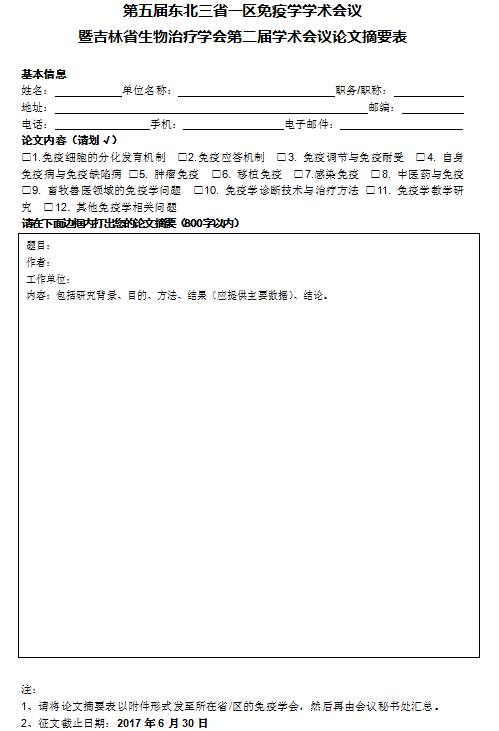 2. 請使用《第五屆東北三省一區(qū)免疫學(xué)學(xué)術(shù)會議論文摘要表》撰寫來稿。
